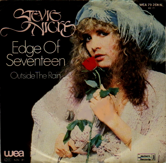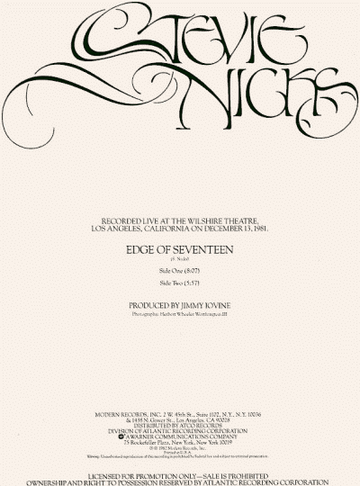 [Click album cover for a larger image] After the Glitter Fadesreleased 4/30/82b-side: Think About It Blue Denimreleased 8/94cassette b-side: Mirror MirrorU.K. CD single b-sideThousand Days, Inspiration Blue Denim3-inch CD released in Japanb-side: Inspiration Crying in the Nightreleased February 1974b-side: Without a Leg to Stand onre-released June 1976 b-side: Stephanie Edge of Seventeenreleased 2/82b-side: Edge of Seventeen (live) Edge of SeventeenItalian releaseb-side: Leather and Lace Edge of Seventeenreleased April 1982 U.K.b-side: Outside the Rain Edge of SeventeenDutch releaseb-side: Outside the Rain Has Anyone Ever Written Anything For Youreleased 5/12/86b-side: Imperial Hotel I Can't Waitreleased 2/10/86b-side: The Nightmare I Can't Wait (Timespace version)released 11/91b-side: Sleeping Angel, Edge of Seventeen I Can't Waitreleased in the U.K. I Can't Waitreleased in Japan If Anyone Fallsreleased 9/3/83b-side: Wild Heart If Anyone Fallsreleased in Japanb-side: Wild Heart If You Ever Did Believereleased 1998 Leather And Lacereleased 10/6/81b-side: Bella Donna Leather and Lacereleased October 1981 U.K.b-side: Outside the Rain Leather and Lacereleased in Japanb-side: Edge of Seventeen Long Way to Goreleased July 1989 U.K.b-side: Real Tears Long Way to Goreleased in Japanb-side: Real Tears Love's a Hard Game To Playreleased November 1991b-side: Sleeping Angel (remix) Love's a Hard Game To PlayJapan Importb-side: I Can't Wait, Edge of Seventeen (live), Battle of the Dragon, Sleeping Angel (remix), I Can't Wait (Dub) Maybe Love Will Change Your Mindreleased 94b-side: Inspiration Maybe Love Will Change Your Mindreleased June 1994 U.K. Needles and Pins Nightbirdreleased January 1984 U.K.b-side: Nothing Ever Changes Planets of the Universereleased May 2001edit and album version Reconsider Mereleased 1998Promo CD Rooms on Firereleased 4/21/89b-side: Alice Sometimes It's A Bitchreleased 8/91b-side: Desert Angel Sometimes It's a Bitchreleased August 1991 U.K.b-side: Battle of the Dragon, Desert Angel Sometimes It's a Bitch3-inch CD released in Japan Stand Backreleased 5/19/83b-side: Garbo Stand Backreleased in Japan Stop Draggin' My Heart Aroundreleased 7/8/81b-side: Kind Of Woman Stop Draggin My Heart Aroundreleased in Japan Talk to Mereleased 10/28/85b-side: One More Big Time Rock And Roll Star Talk to Mereleased in Japanb-side: One More Big Time Rock And Roll Star Talk to Mereleased March 1986 U.K.b-side: One More Big Time Rock And Roll Star, Imperial Hotel Talk to MeSpain promo Two Kinds of Lovereleased in Austriab-side: Real Tears Two Kinds of Lovereleased 8/11/89b-side: Real Tears Whole Lotta Troublereleased 10/13/89b-side GhostsU.K. bside: Beauty & the Beast (live), Rooms on Fire Promos Edge of Seventeenrecorded live 12/13/8112 inch vinylsee back cover